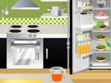 El mango es la base de la receta, así que lo primero es localizarlo en la cesta de productos a la izquierda, ya que no se conserva en el refrigerador. Luego lo cortas con cuchillo en dos mitades, extraes el jugo de cada una y lo reservas para mezclarlo con otros zumos. Después hierves esa mezcla hasta lograr una textura espesa que servirá como base del postre.