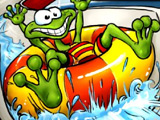 Desde el menú principal eliges rana y arrancas la siguiente bajada por el tobogán. Remas con las flechas para guiar el flotador y te inclinas hacia delante o hacia atrás para ajustar la velocidad en subidas y descensos. En los trampolines ejecutas trucos en el aire que suman puntos al marcador final, mientras recoges ítems repartidos por la pista que dan impulsos breves u otros efectos útiles. Conviene vigilar el indicador de progreso de la parte inferior para saber qué tan cerca estás de la meta y de los puntos de control. Si chocas contra un obstáculo o sales del camino, hay golpe y reapareces al inicio del nivel o en el último control pasado con bandera amarilla; el cronómetro sigue corriendo y cada error te roba segundos del tiempo final. Al cerrar cada carrera, un buen registro te asegura medallas de oro, plata o bronce, además de nuevas aquadencias para gastar entre intentos. Con esa moneda mejoras la fuerza de remada para trazar curvas con más control, activas un turbo con más empuje para los sprints y, cuando reúnes suficiente, compras un flotador nuevo que otorga bonificaciones a varios parámetros a la vez.